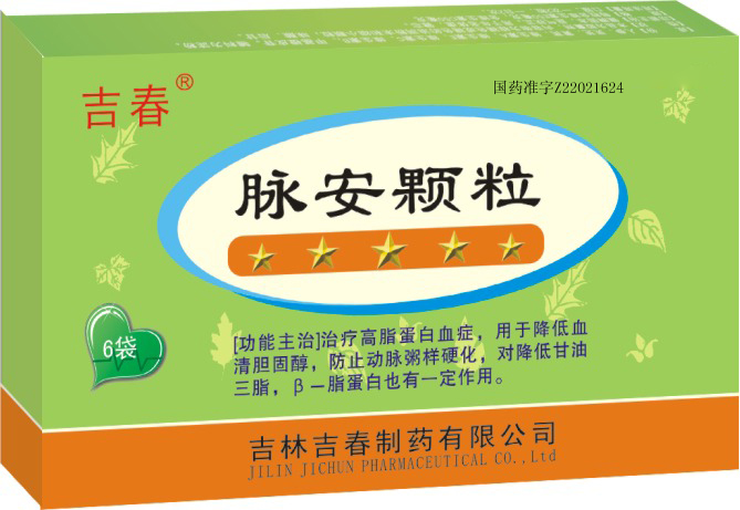 【藥品名稱】脈安顆粒 【功能主治】治療高脂蛋白血癥,用于降低血清膽固醇,防止粥樣動脈硬化,對降低甘油三酯,β-脂蛋白也有一定作用。 【規(guī) 格】每袋裝20g。 【用法用量】口服。一次1袋,一日2次。 【包 裝】藥用復(fù)合膜袋包裝。20g/袋×6袋/盒。 【有 效 期】36個月 【批準文號】國藥準字Z22021624